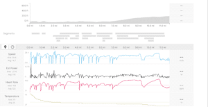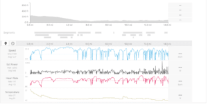 Note there is a key difference. I did that return ride in the dark with good lights and bright clothing. There is a lot less traffic so my initial miles in the city allow me to ride a touch harder and faster. Riding home I need not worry about showing up sweaty or winded. Note the average speed is 14.7 mph but the max speed, even though most of the ride ramps up in elevation, was 28.4. Of particular note are those long heart rate plateaus near the end. I strove to put myself in what coaches call the “sweet” spot of training, which is sit at about 90 percent of your sustainable effort. (for data freaks, that would be 253 watts for me or 153 bpm on my heart rate). And I held it. After a short rest between two intersections, I then ramped it up to finish with my highest heart rate of the evening at the very end. Of particular note is all those spikes in the line. Were I to pay $100 to a personal trainer, they would likely prescribe just such a plan for an hour.
